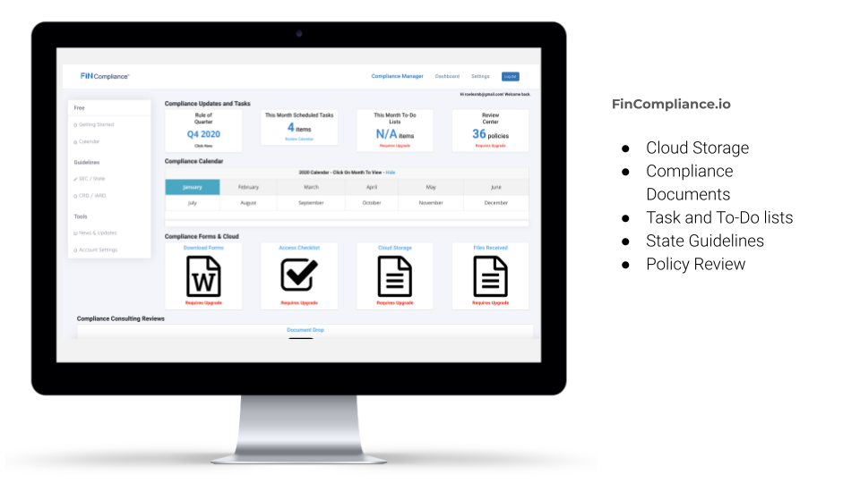 FinCompliance, based in Walnut Creek, CA provides a consortium of compliance services. In addition to offering RIA/financial services consulting, they are also trying to build a compliance management software, FinCompliance.io. The software offers self-serve compliance reviews, policy and procedures and task management tools to registered investment advisors (RIAs).